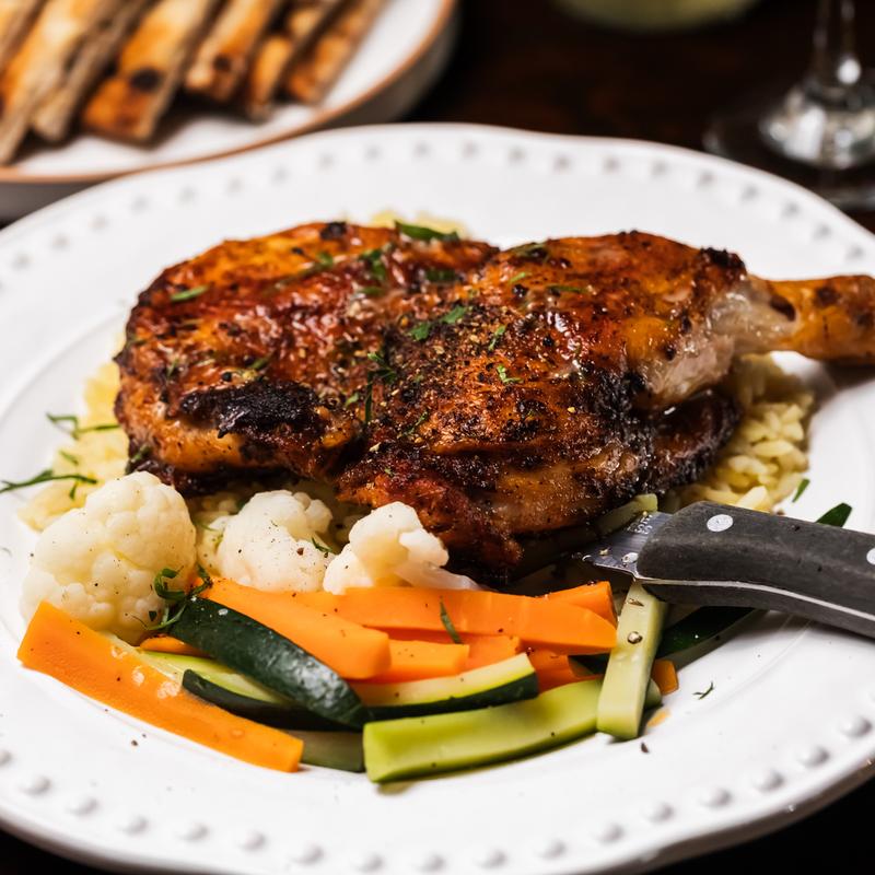 Roasted rice pilaf, steamed vegetables.