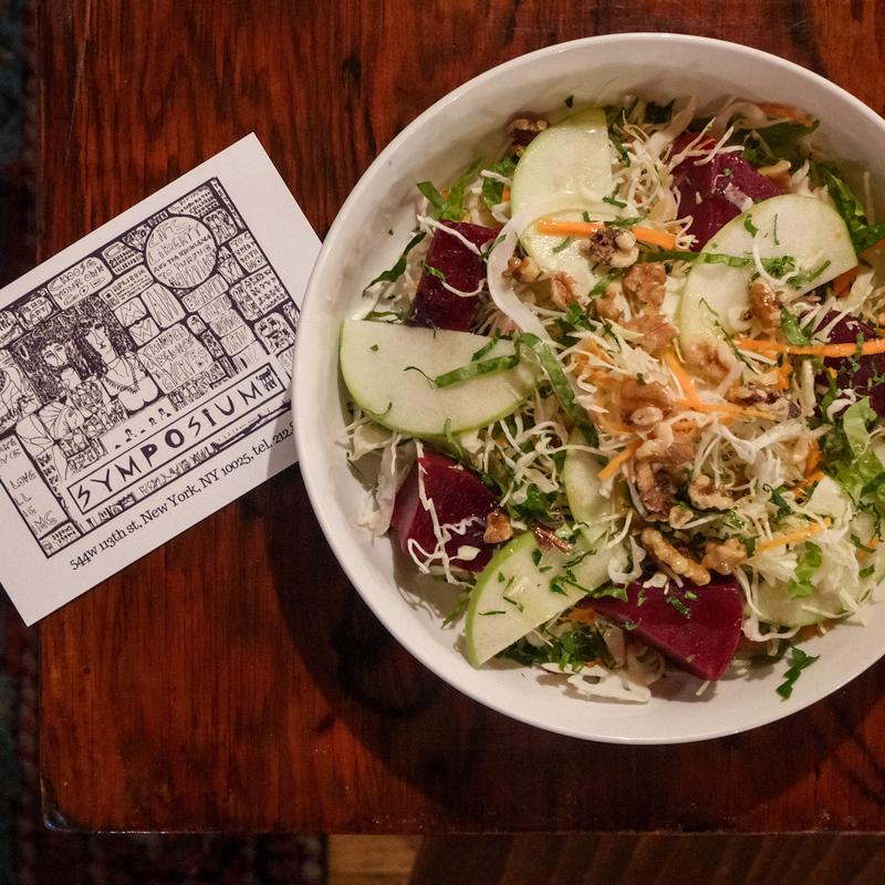 Carrot, apple, pickled red onion, walnut, cabbage.
